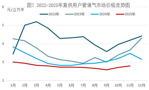 根据卓创资讯统计,11月下游直供用户的用气价格为2.8元/立方米,同比下跌0.67元/立方米,环比上涨0.08元/立方米。受天然气市场供需宽松影响,直供用户的用气成本逐年下行,2025年各月份皆处于近四年以来同期最低水平。